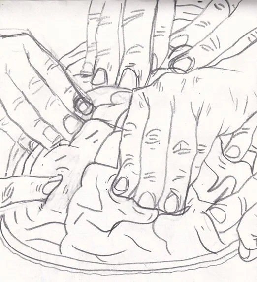 Next I developed the idea by creating a digital collage of my hands massaging a brain. I then drew the collage by hand and scanned the drawing.
